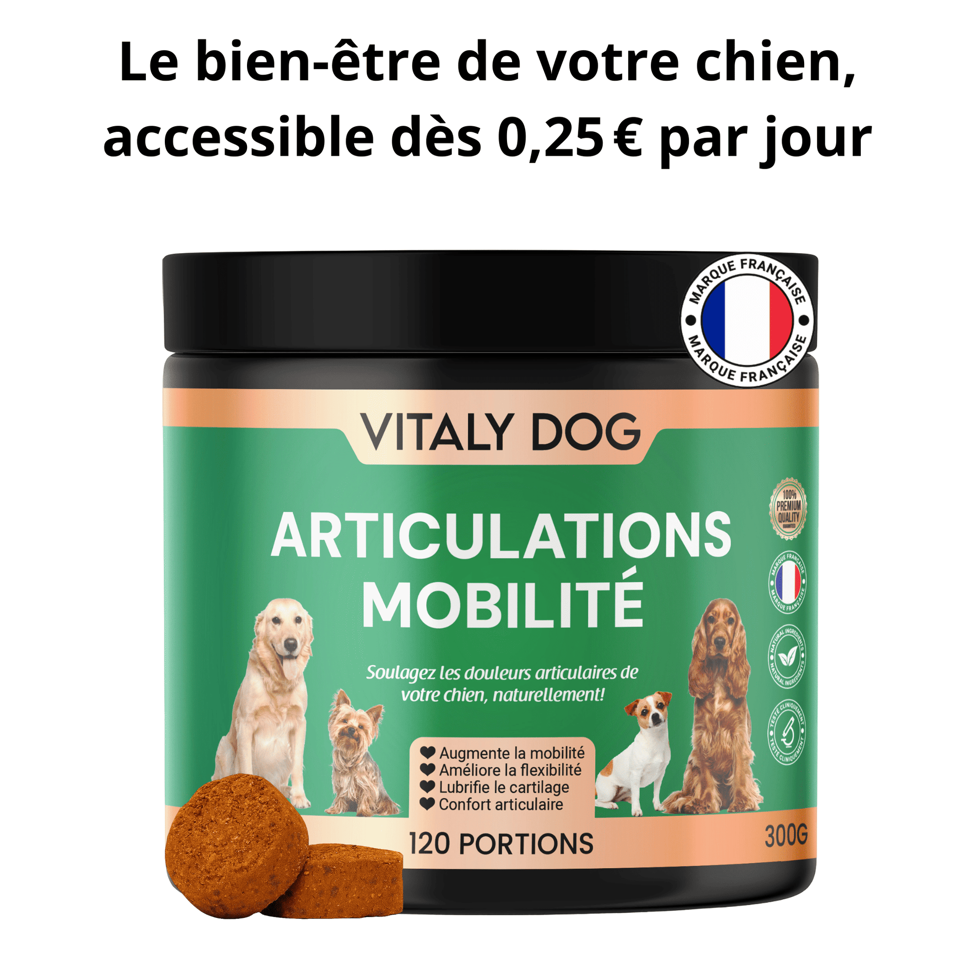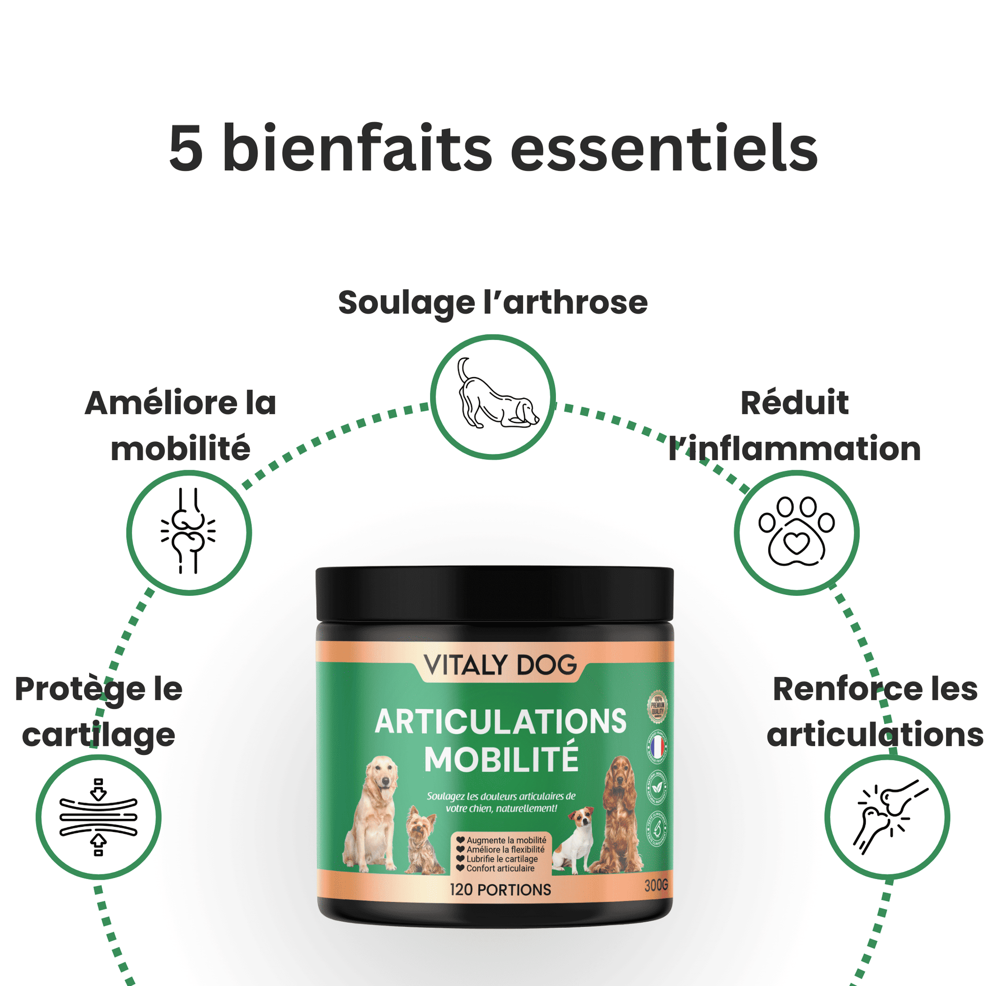 soutiennent le cartilage et aident votre chien à retrouver souplesse et confort au quotidien. Offrez-lui la liberté de bouger sans souffrir, et redécouvrez le bonheur de partager des moments complices, sans limites.