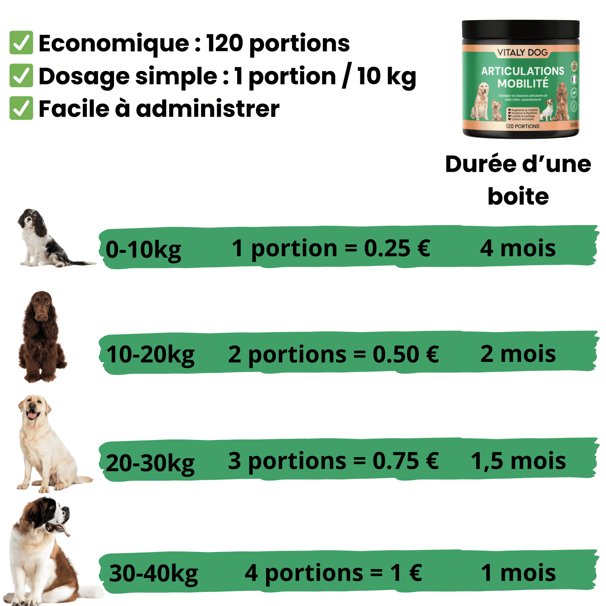 Nous recommandons une utilisation régulière de 8 à 12 semaines pour des résultats optimaux. La durée peut varier en fonction des besoins spécifiques de votre chien.